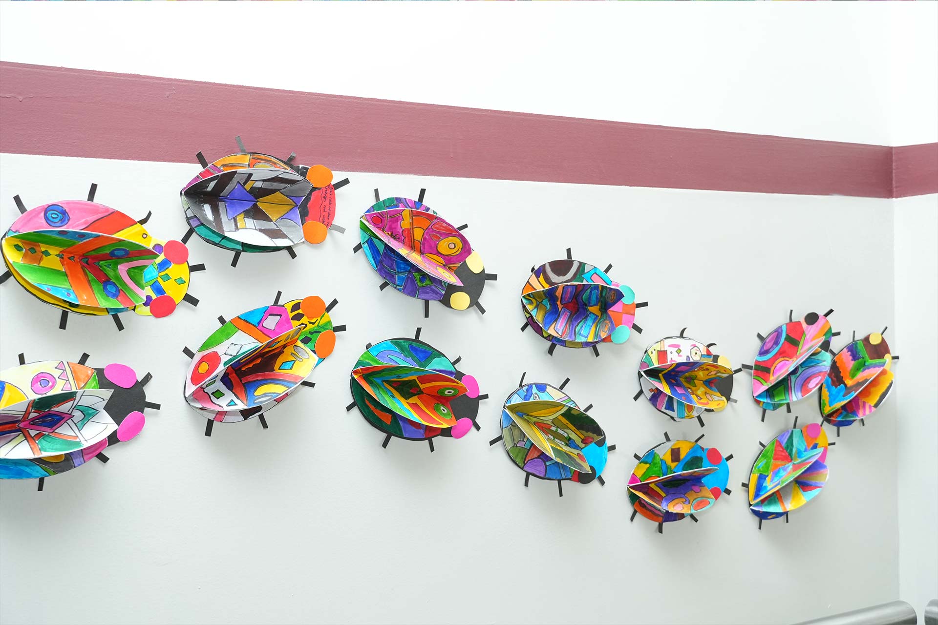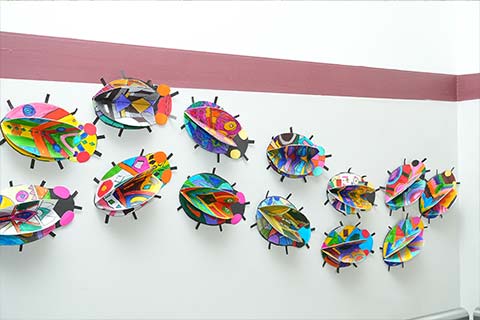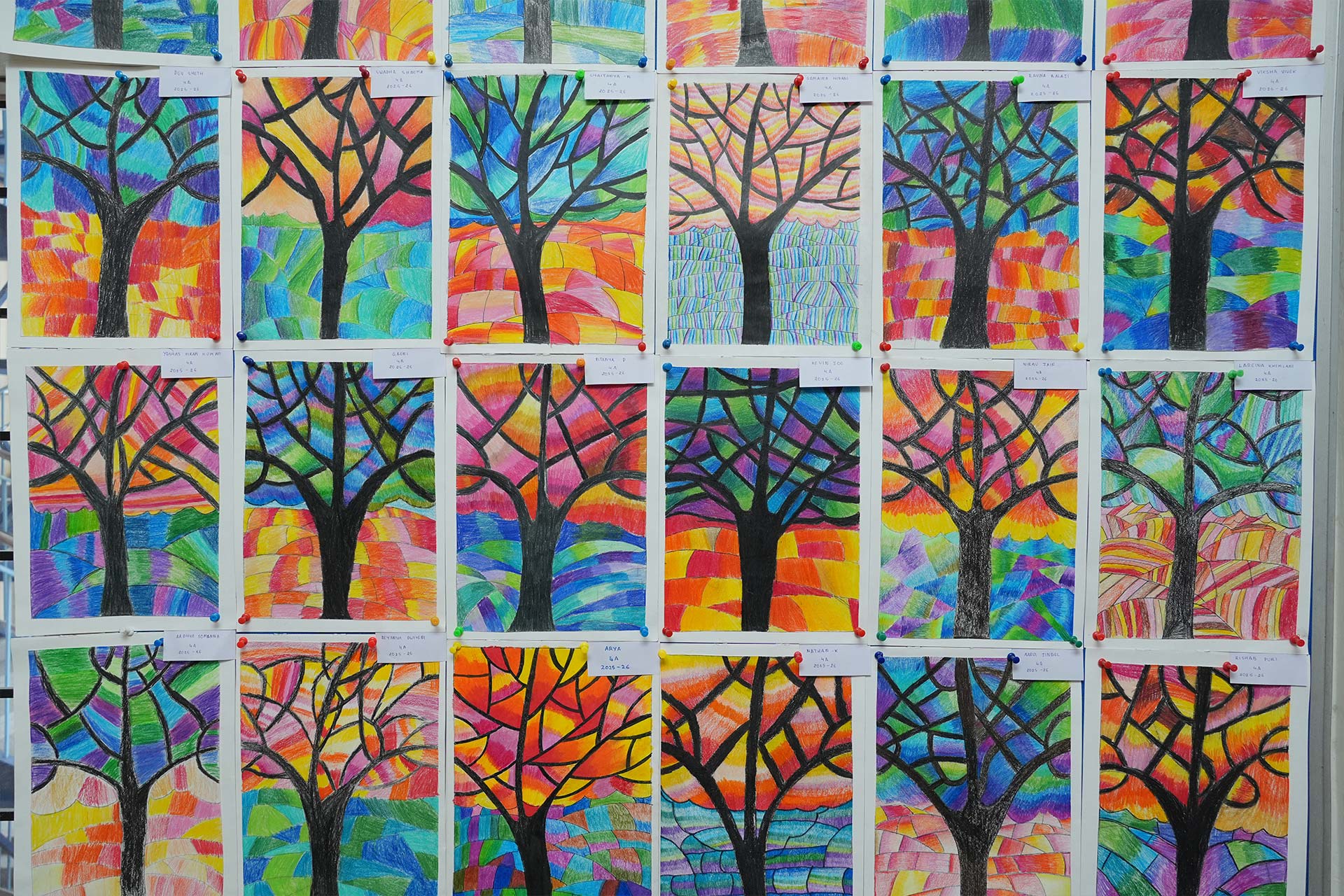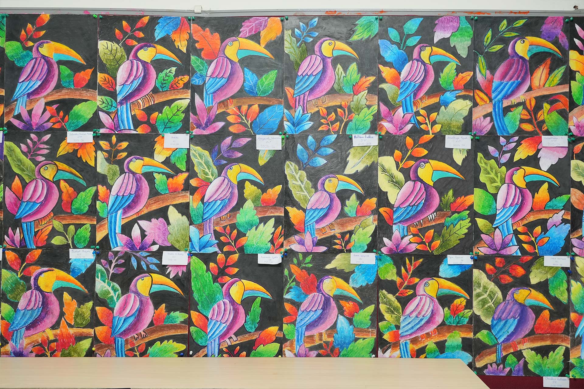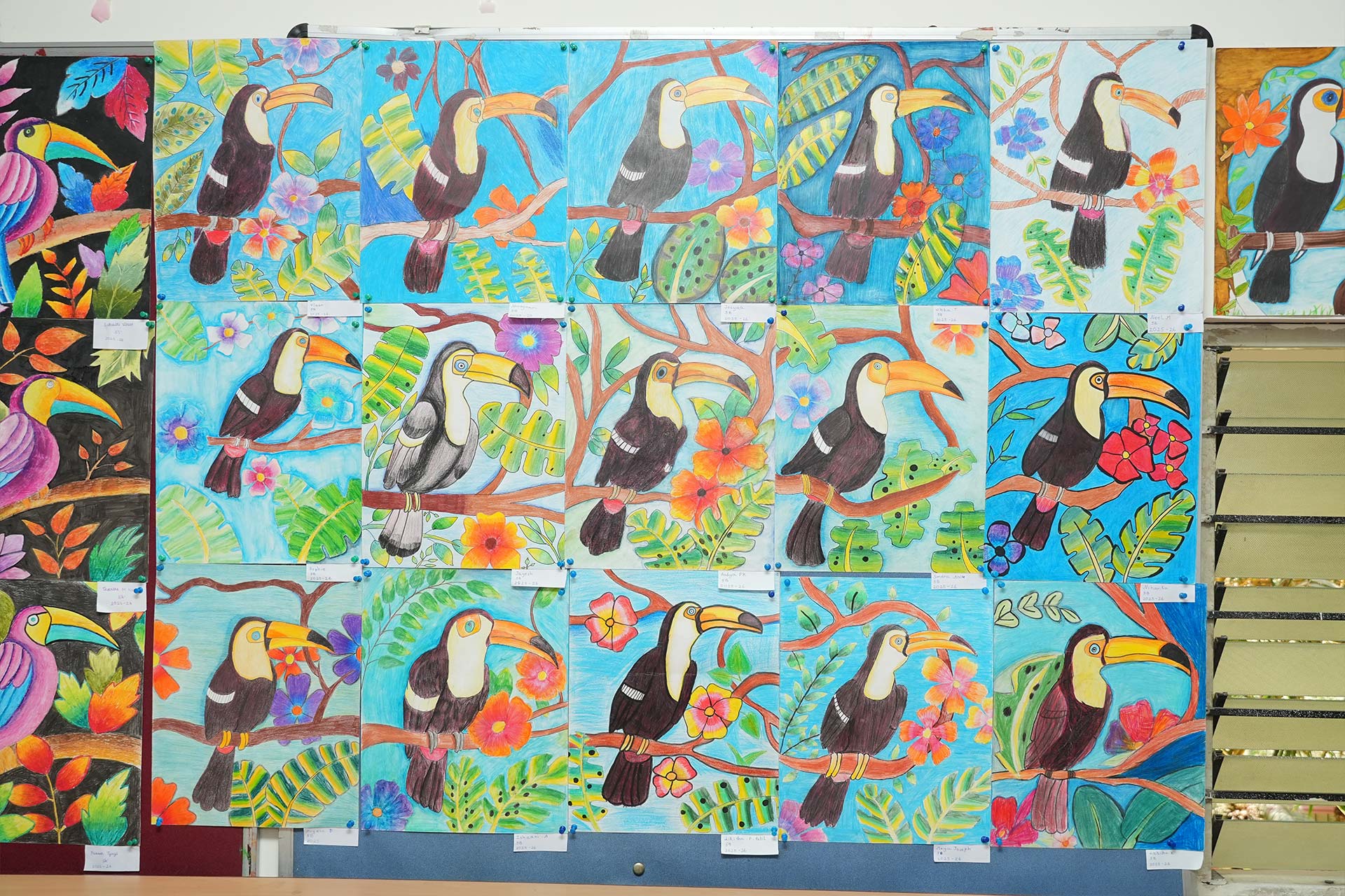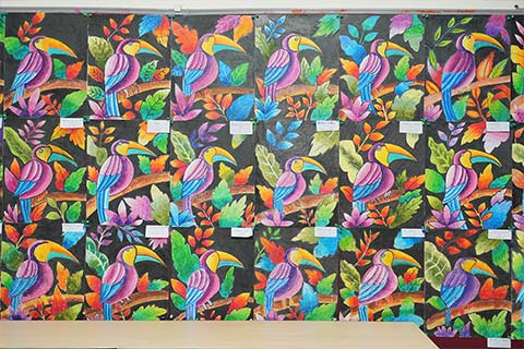 Grade 6 explored circular patterns and reflective effects through Life in a Bubble and Mirrored Eclipse. Grade 5 brightened the display with vibrant oil pastel Terrific Toucans, while Grade 4 showcased abstract trees in Contrasting Natures alongside colourful, symmetrical beetles.