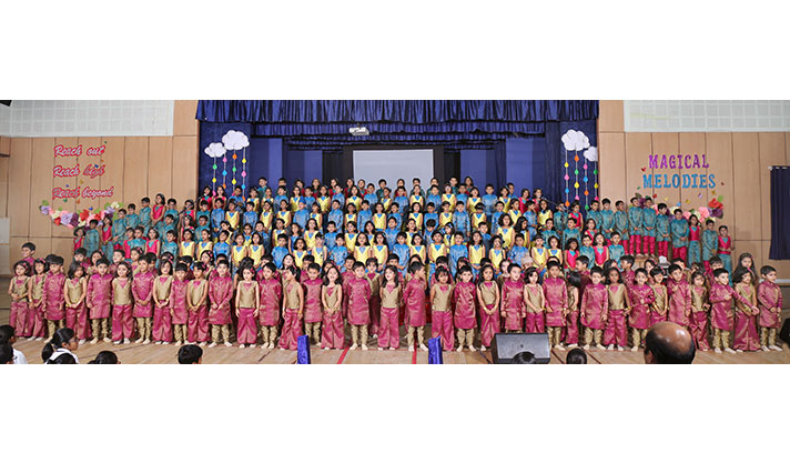 Magical Melodies, the triennial musical show by the Kindergarten and Montessori students was organized on the 23rd of February. The show began with the welcome speech by the students of KG2, followed by glimpses of the action packed days enjoyed by the cute toddlers through a video. Harmonious symphonies in English, Hindi, Tamil, Telugu, Spanish, African and Hebrew pervaded the atmosphere as the tiny tots beautifully rendered lyrics in various languages. The sweet tunes were enjoyed by the audience as they tapped their feet and nodded their heads.